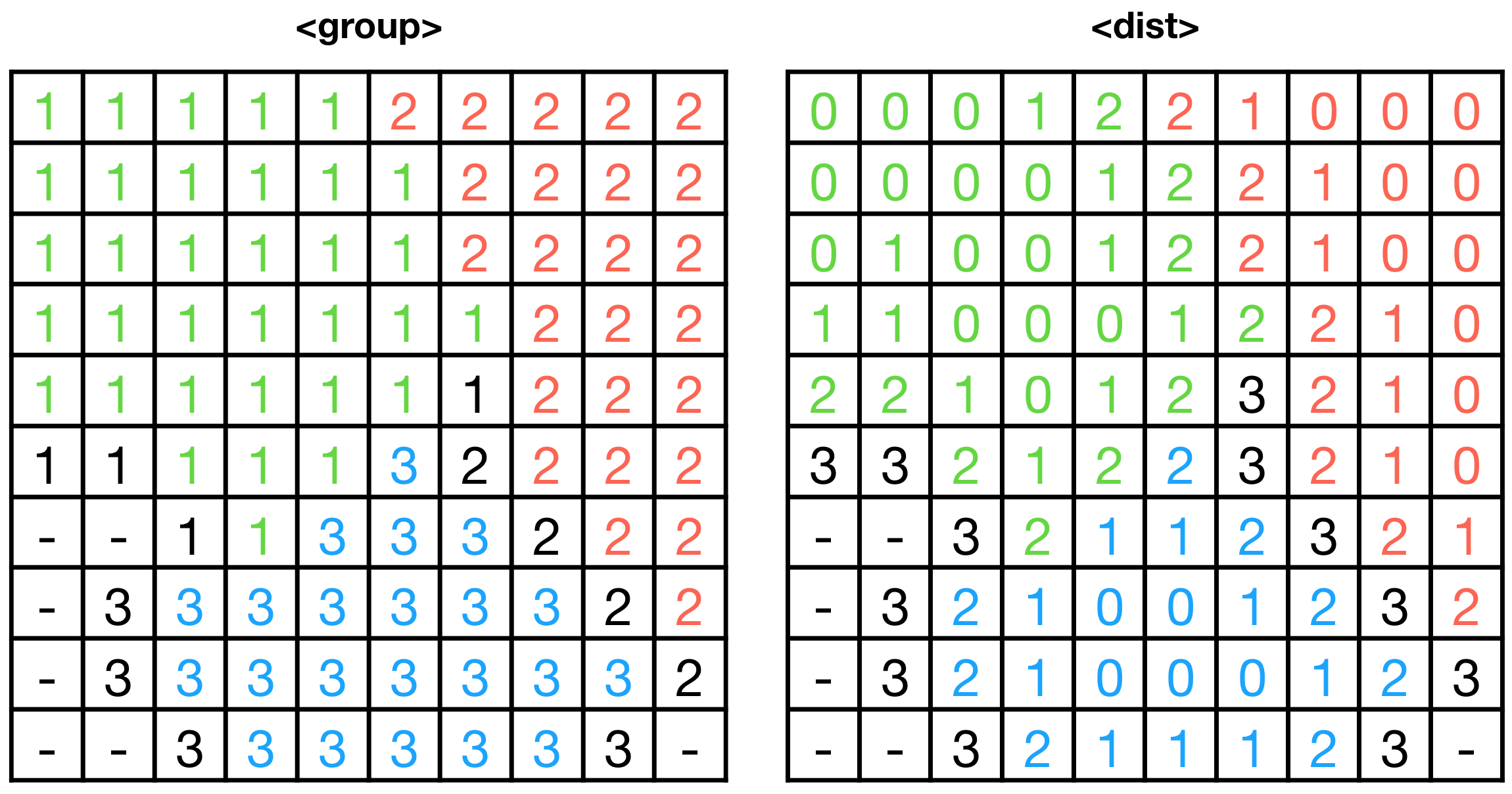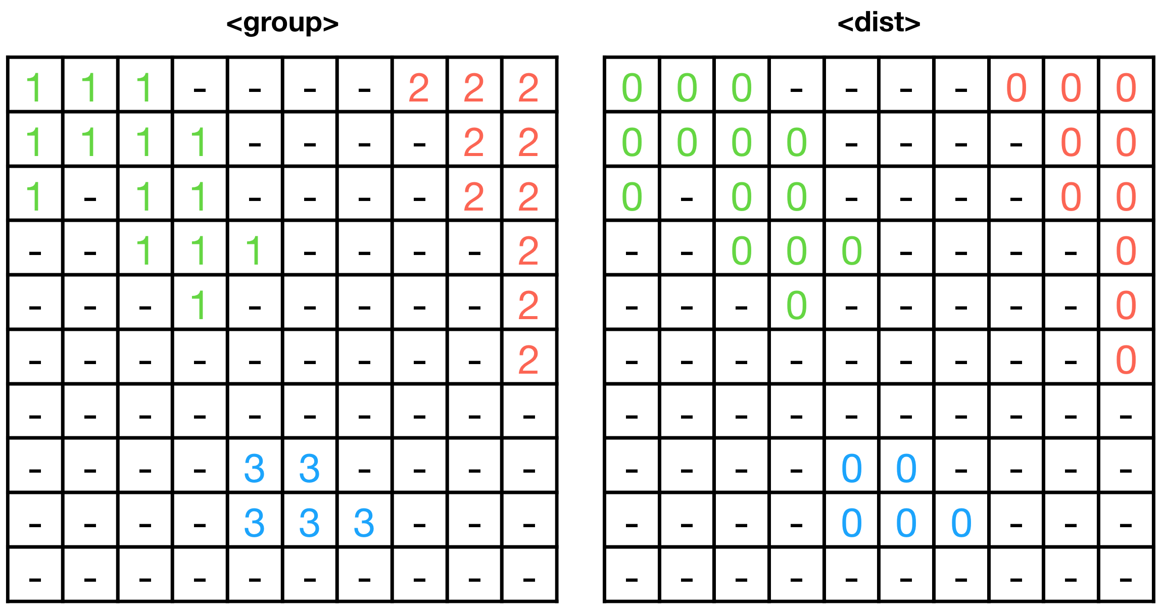 - 그룹번호와 거리 두가지를 각각 BFS 탐색으로 확장시킨다.