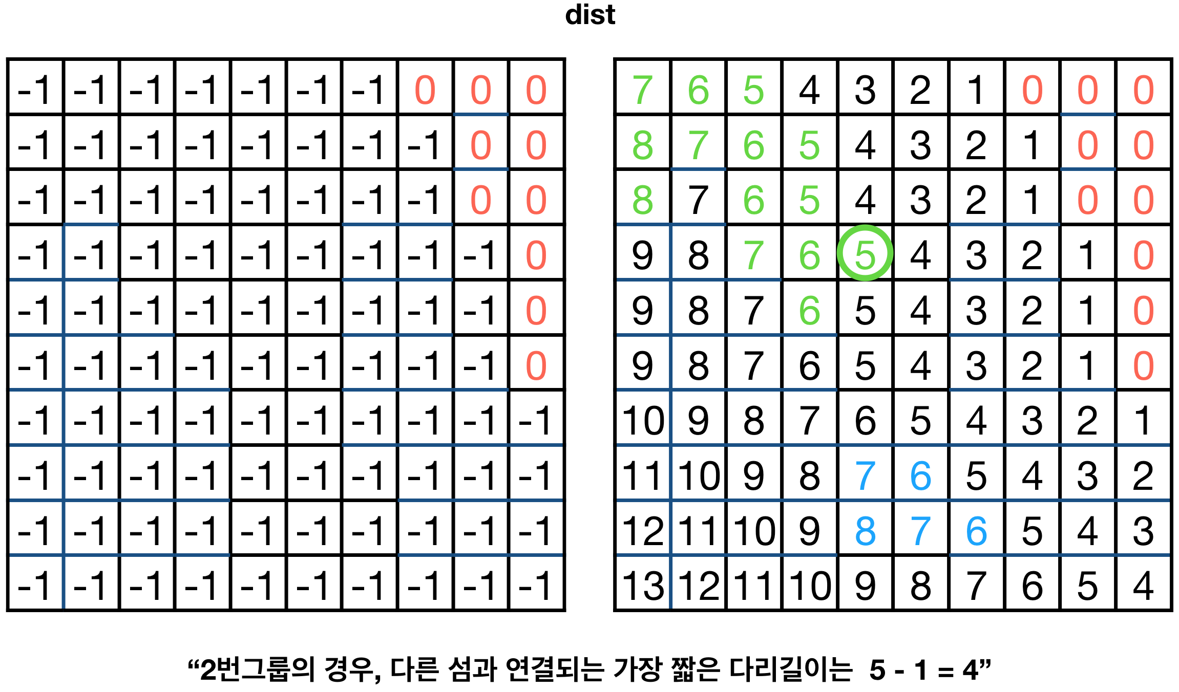 - 그 다음 각각의 그룹에 대해서 BFS탐색을 이용해 모든 땅에대한 거리를 계산한다.