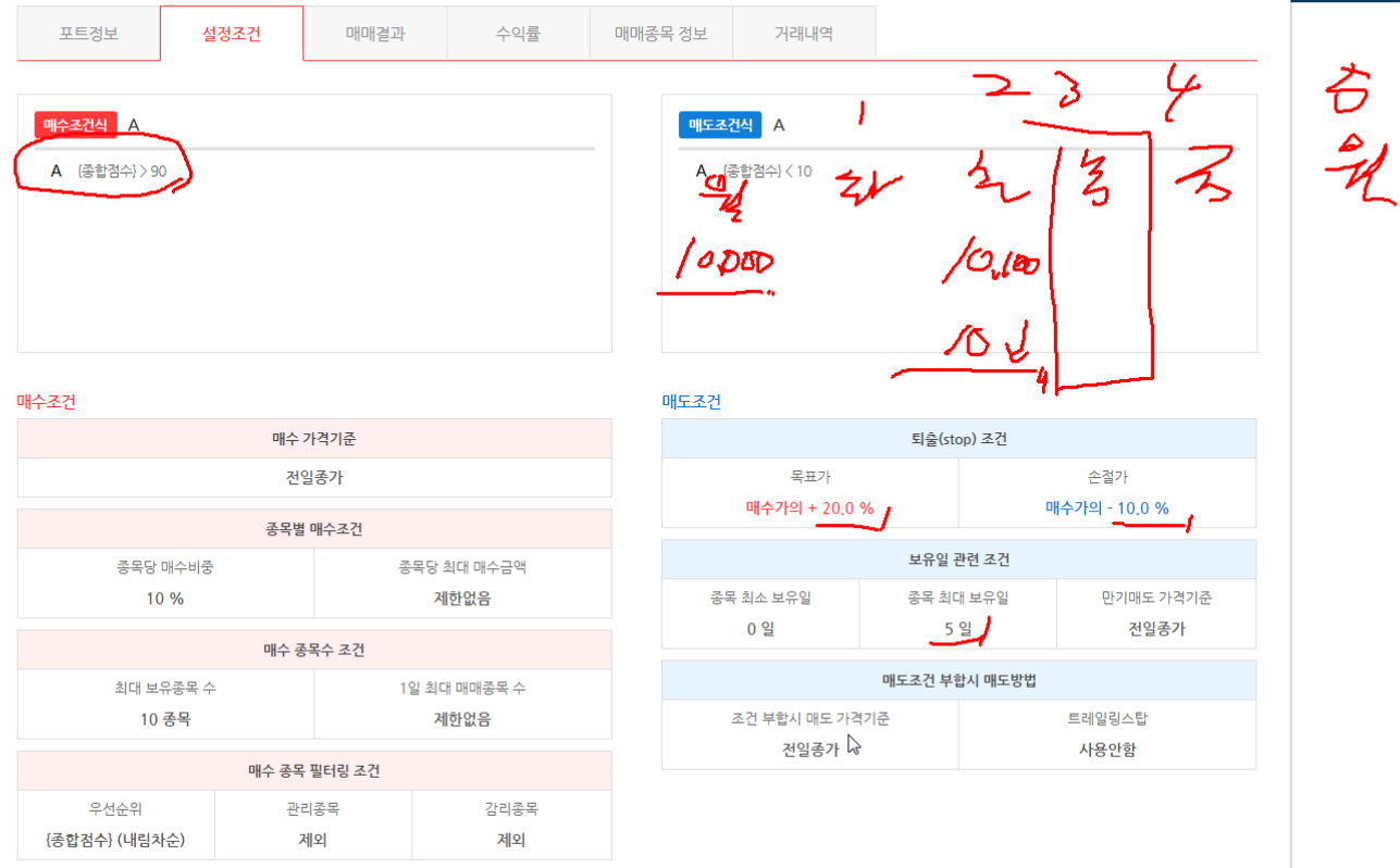 윌요일에 매수조건(종합점수 > 90)을 만족하여 매수된 종목이 있다고 가정할 때,